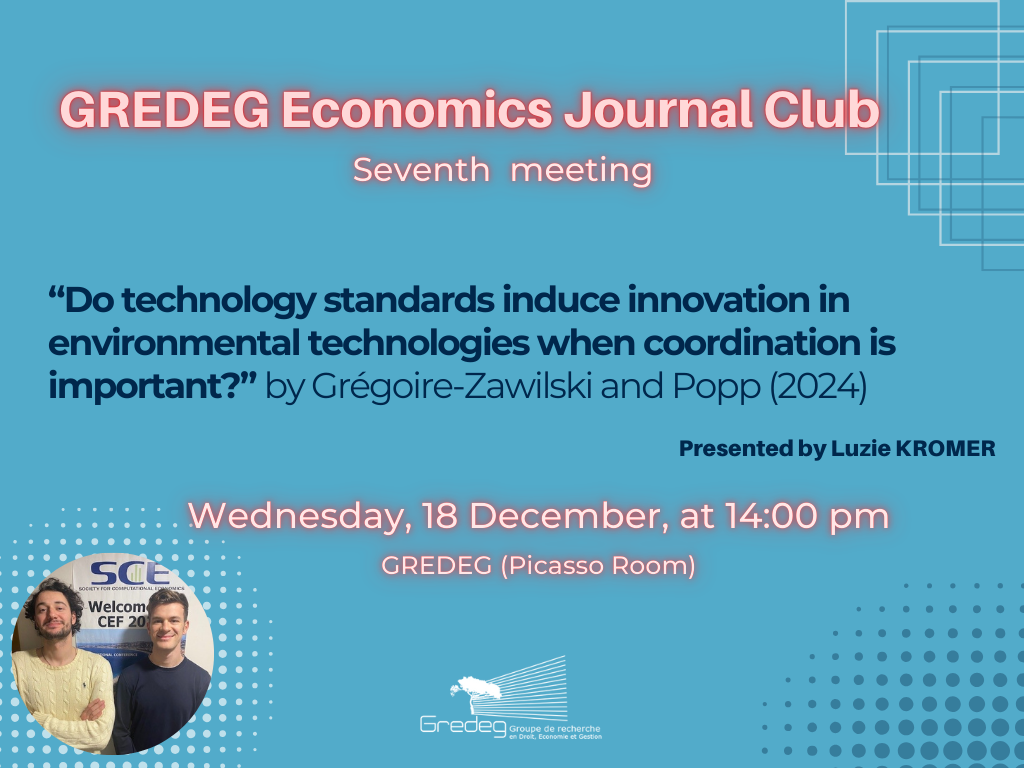 In this session, Luzie Kromer, visiting researcher from Technical University Berlin, will present the paper “Do technology standards induce innovation in environmental technologies when coordination is important?” by Grégoire-Zawilski and Popp (2024), which examines how interoperability standards affect firms’ innovation behaviour in smart-grid technologies. Luzie will also give a brief introduction to how standardization works and how standards can affect firms beyond purely economic outcomes.