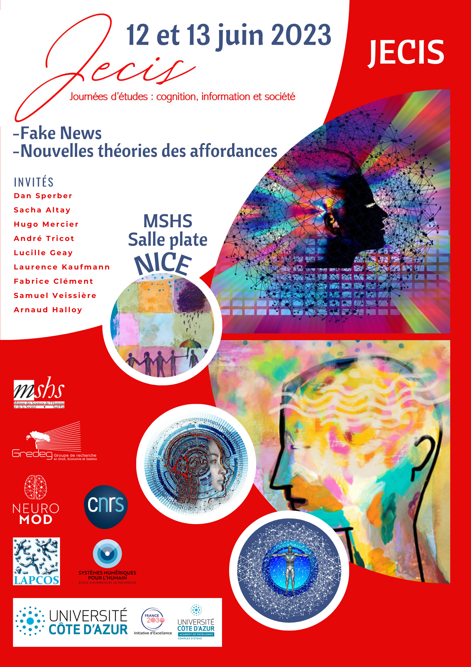 Les Journées d’études cognition, information et société (JECIS) ont pour objectif de valoriser les travaux de recherche qui se situent à la croisée des sciences cognitives, des sciences sociales et des sciences informatiques. Elles ont ainsi pour vocation de favoriser la pluridisciplinarité et l’interdisciplinarité en permettant aux chercheurs qui s’intéressent à la cognition, à l’information et à la société de présenter et de discuter ensemble les théories, les concepts, les méthodes et les résultats qu’ils développent dans leurs travaux. Les JECIS sont organisées une fois par an et portent, à chaque fois, sur une thématique particulière définie par son comité d’organisation et scientifique. Elles sont valorisées par le biais de vidéos misent en ligne sur la chaîne You Tube de la MSHS Sud-Est et d’actes de communication publiés sur la plateforme EPI-REVEL de l’Université Côte d’Azur.
