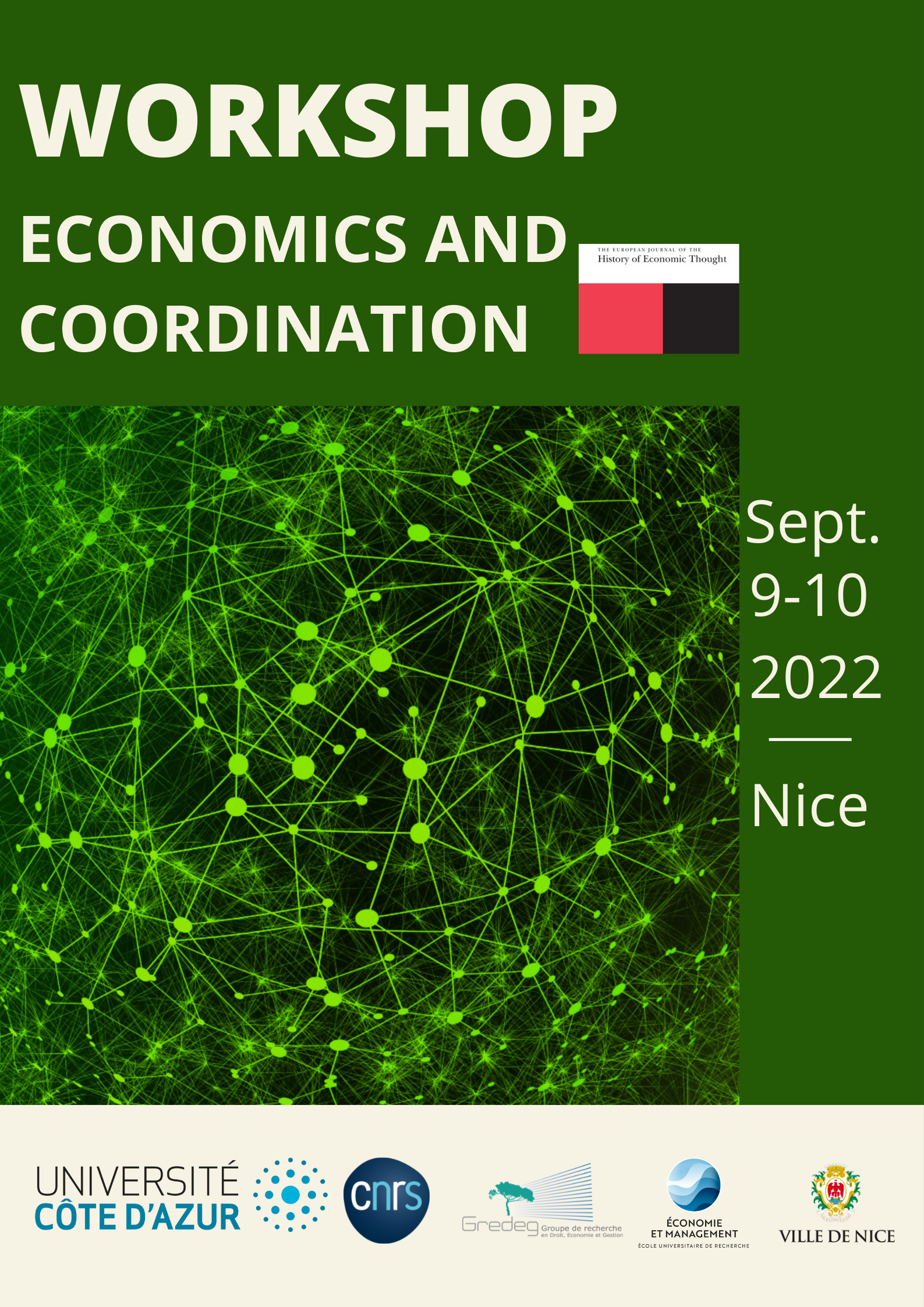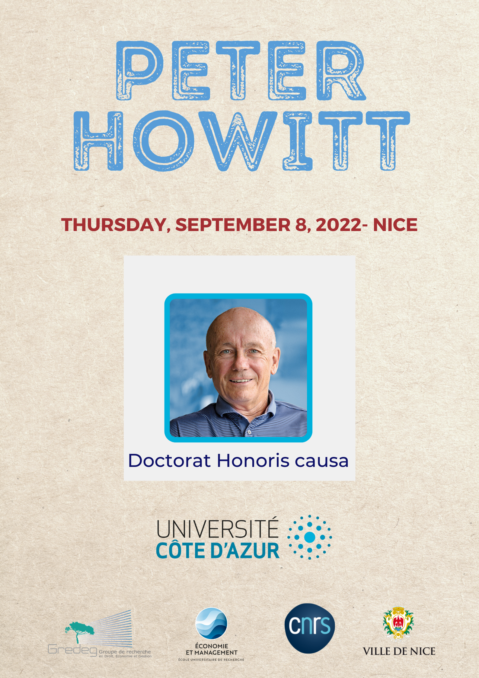 Following the award of an honorary doctorate from the University of Côte d'Azur (CNRS GREDEG) to Professor Peter Howitt on 8 September 2022, a workshop will be organised in cooperation with EJHET, the European Journal of the History of Economic Thought, on 9 and 10 September 2022.