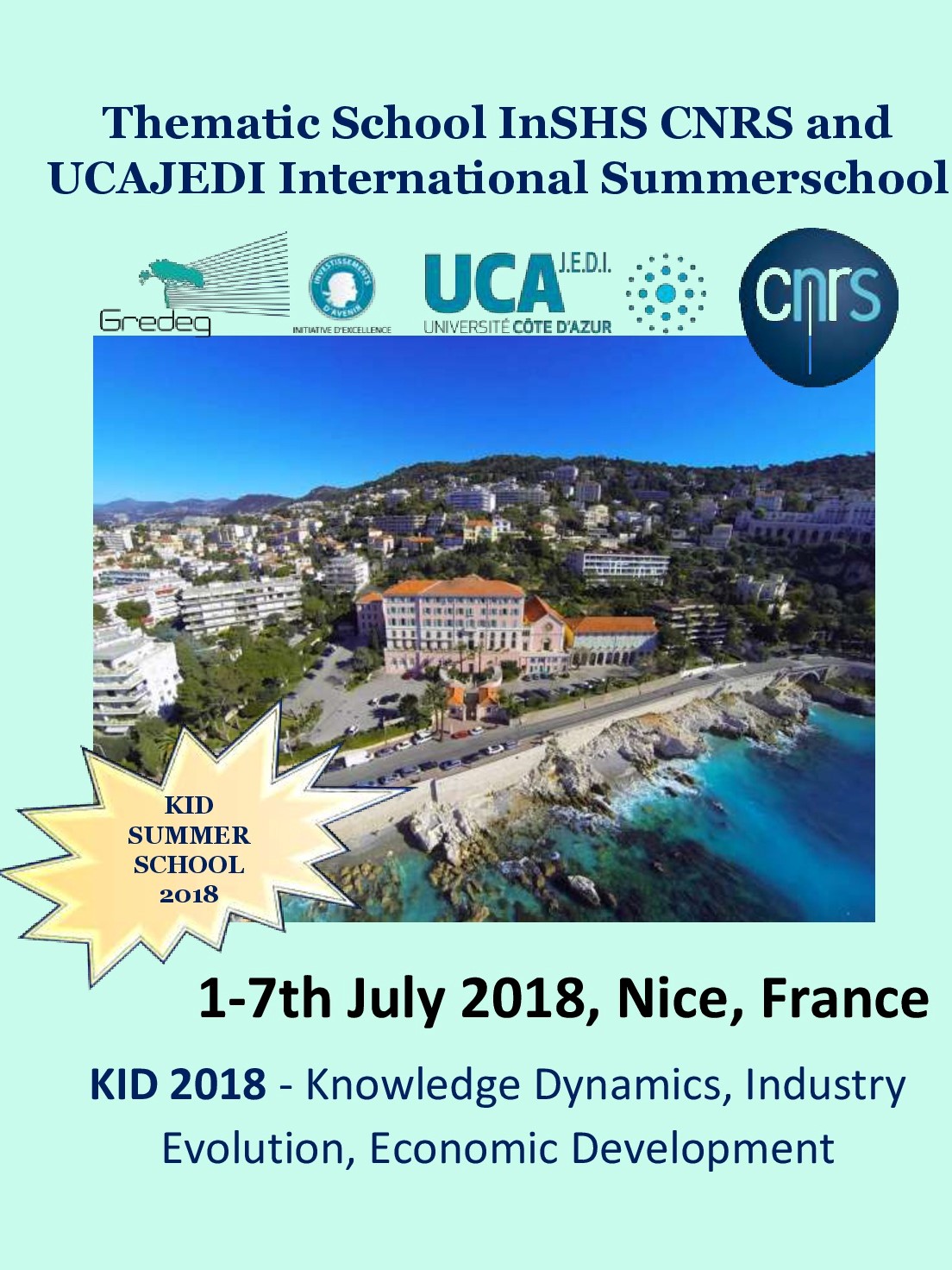 The 8th summer school on “Knowledge Dynamics, Industrial Evolution, Economic Development” (KID 2019) will be held 1-5 of July, 2019, Le Saint Paul Hotel-Maison du Séminaire, 29 Bd Franck Pilatte, Nice (France).