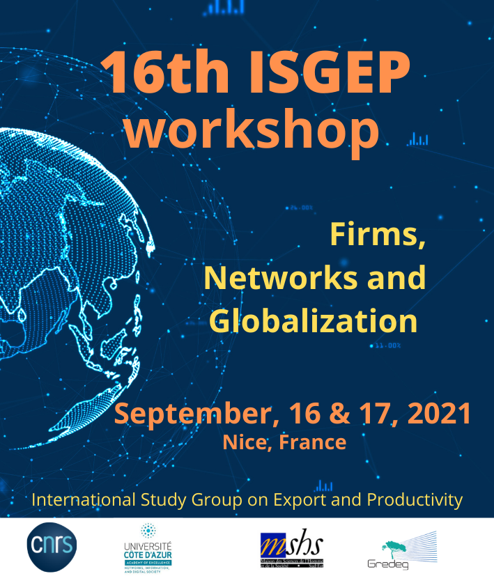 16th ISGEP Workshop – September, 16 & 17, 2021En 2021 le projet structurant HCC du GREDEG a le plaisir d'accueillir la nouvelle édition de la rencontre annuelle des chercheurs du réseau ISGEP « International Study Group on Export and Productivity » autour du thème « Firms, Networks and Globalization » La lecture invitée sera donnée Isabelle Mejean experte de la question de la propagation des chocs le long des chaines de valeurs.