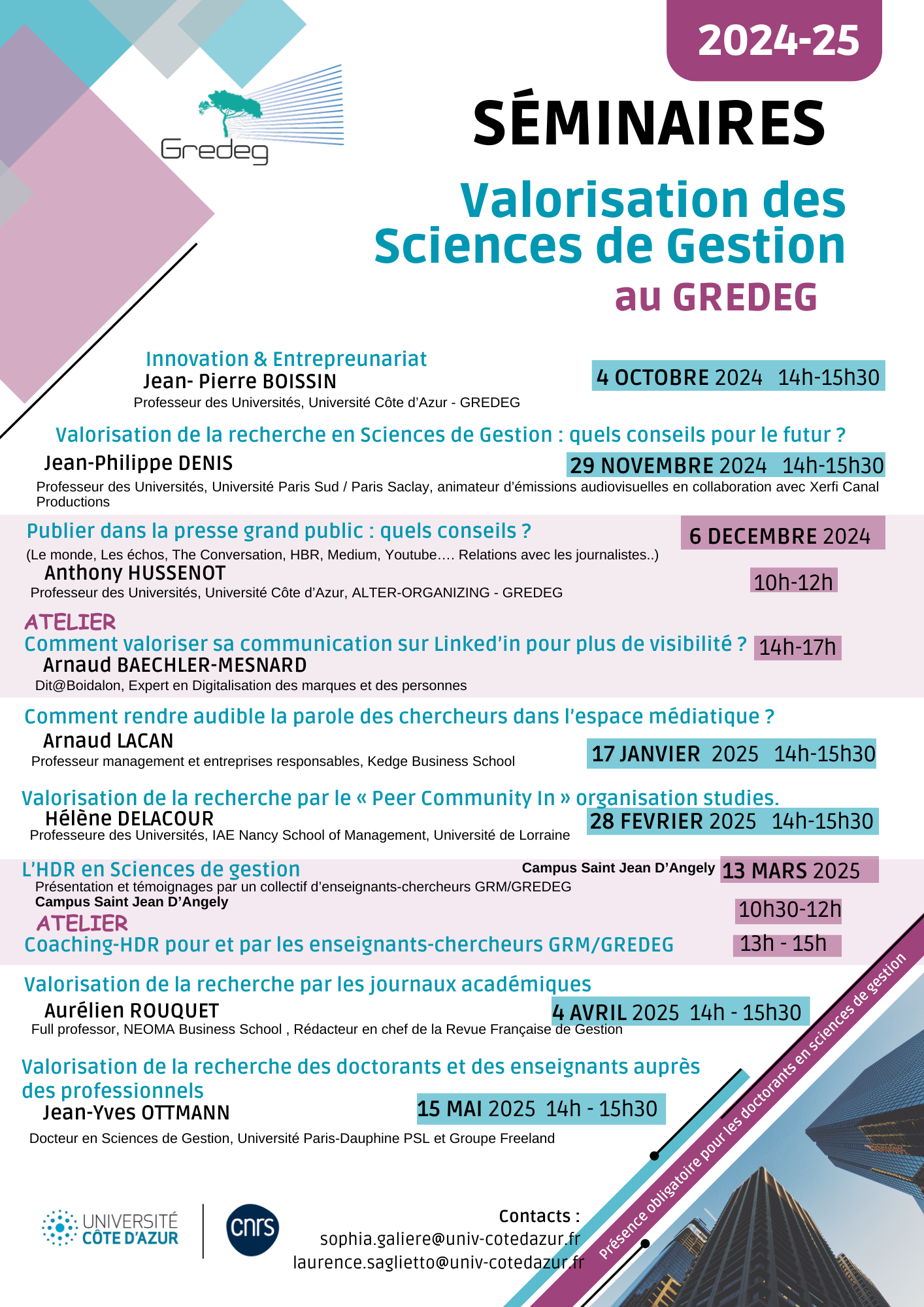 Dans le cadre de la composante GESTION, plusieurs séminaires sont organisés durant l'année universitaire au GREDEG.