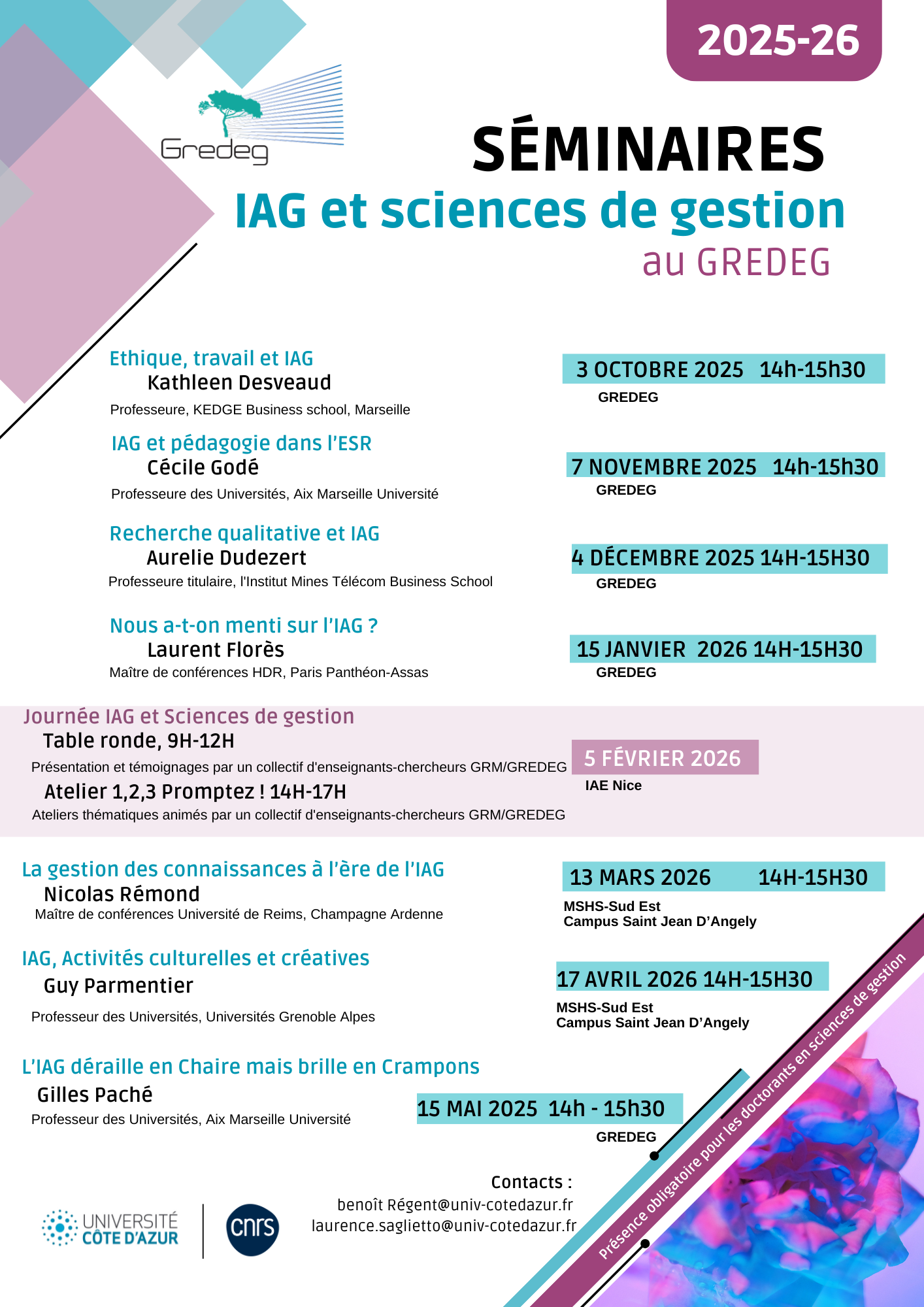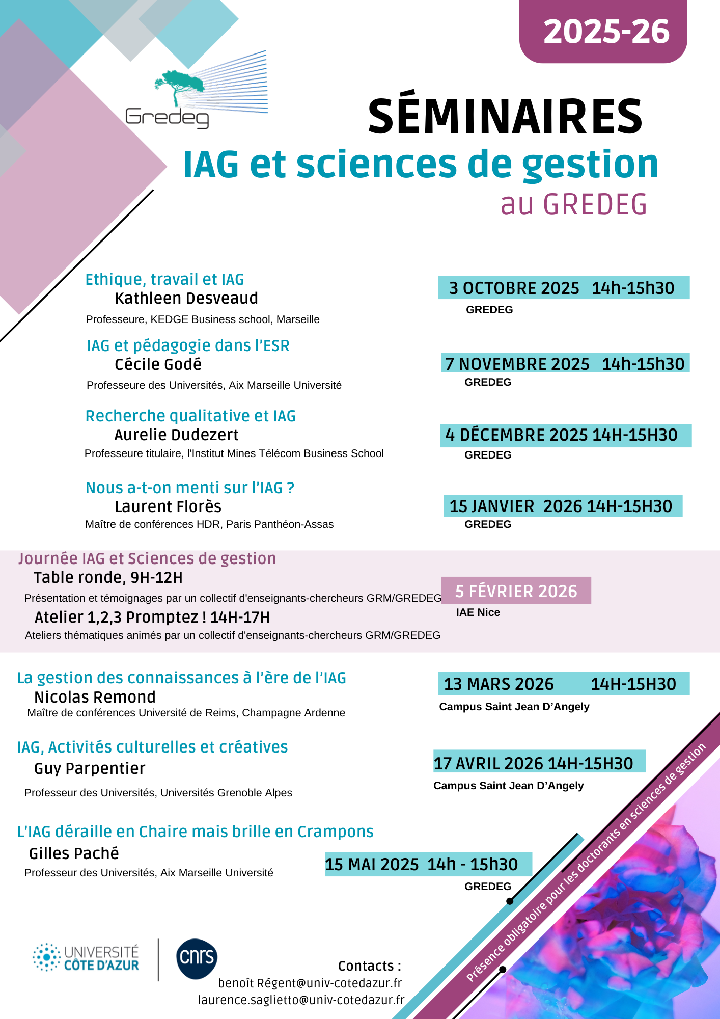 Comme les années précédentes, ces séminaires sont ouverts à tous les membres du laboratoire GREDEG, (enseignants-chercheurs et doctorants), ainsi qu'aux collègues du GRM, de SKEMA et de l’IPAG.